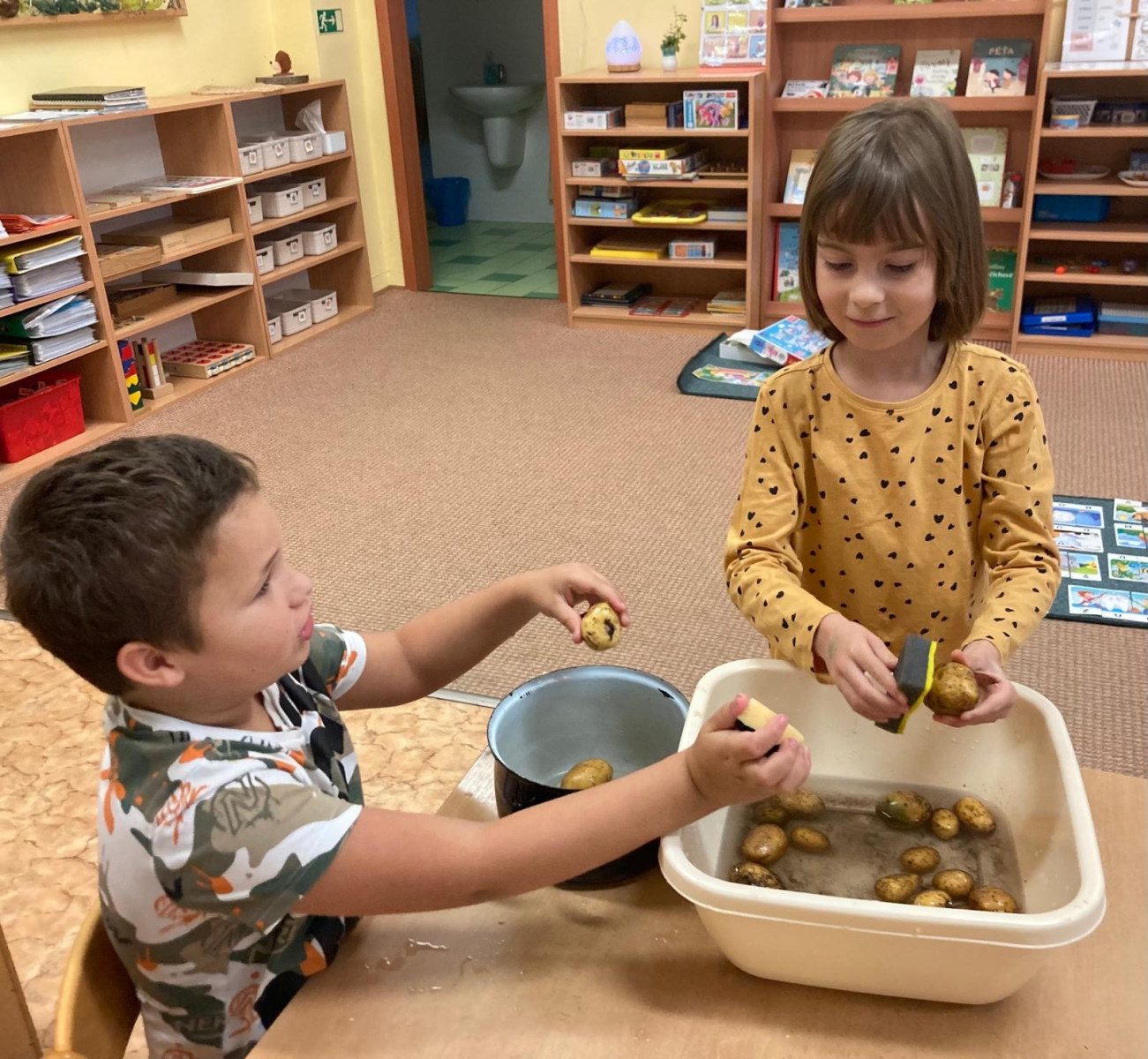 Když přišel čas sklizně, pustily se do práce. Hledání kulatých hlízek pod kořeny bylo dobrodružství! A největší odměna? Omyté brambory si samy uvařily a na loupačku snědly. Nezbyl ani kousek!