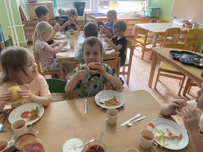 Po vydatném pohybu přišlo zasloužené občerstvení — děti si pochutnaly na ovocném nanuku a k obědu je čekalo oblíbené „dětské menu“ inspirované rychlým občerstvením: hamburger, hranolky, kečup a dressing.