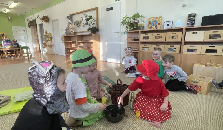 Tento týden se zase děti ponořily do světa pohádek, konkrétně do pohádky o Červené Karkulce. K seznámení s příběhem využily pohádkový kufřík a společně si zahrály divadélko. Připravené kostýmy Karkulky, vlka, myslivce a dalších aktérů děti nadchly a jistě přispěly i k „silným hereckým“ výkonům.  Celé pohádkové dopoledne si děti samy zhodnotily velkým smajlíkem.
