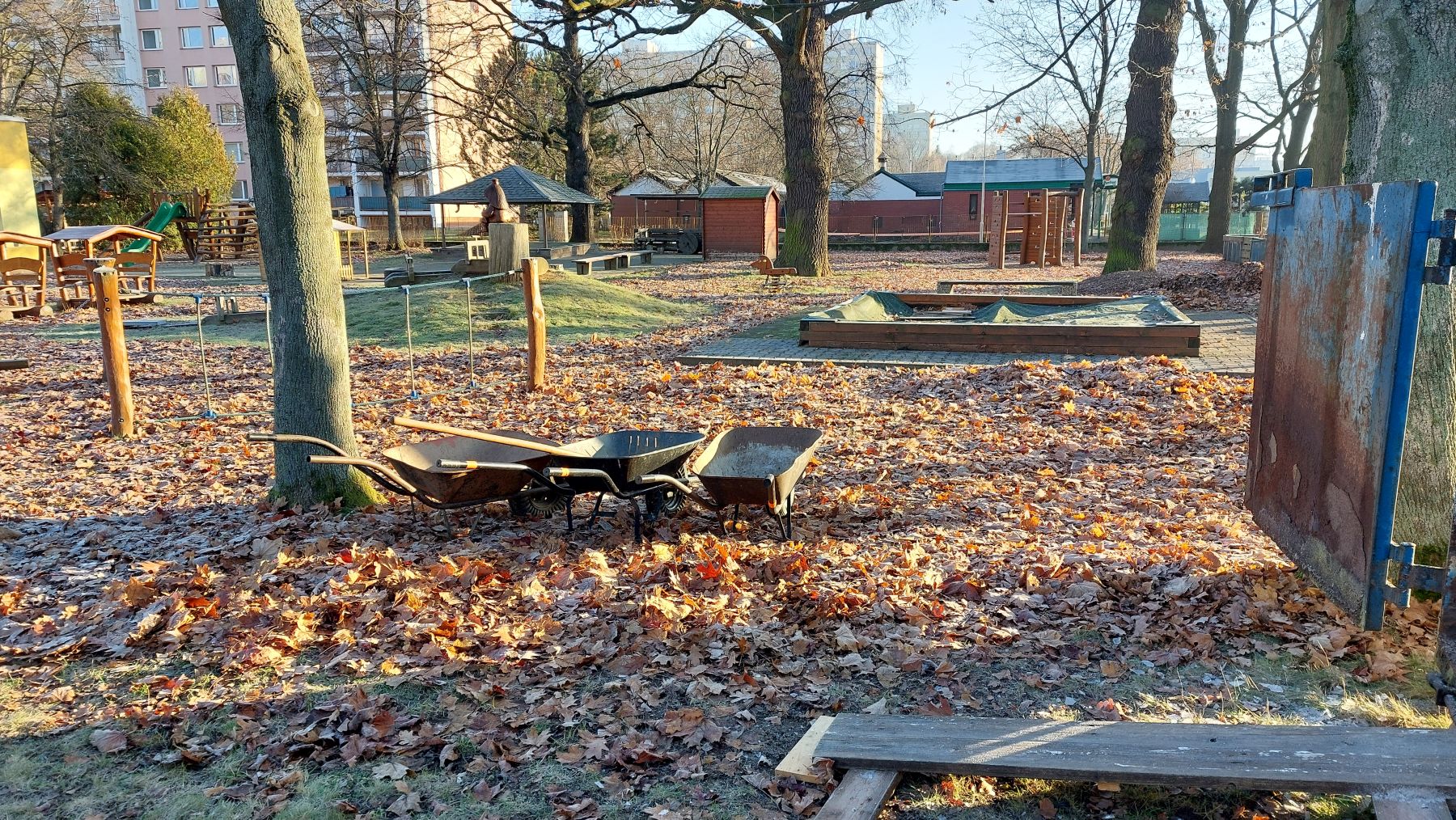 Na shrabání a odvoz ohromného množství listí za zahrady sami nestačíme. Proto již několik let pořádáme podzimní sobotní brigádu, kde zahradu s vydatnou pomocí našich rodičů vyčistíme a připravíme na zimu. Nejinak tomu bylo i letos. Ráno sice mrzlo a zem se třpytila jinovatkou, ale vzápětí vyšlo slunce a pracující dospělé i čiperně pobíhající děti trochu ohřálo. K dobré náladě pomohl i čaj, perník a závěrečné opékání buřtů.