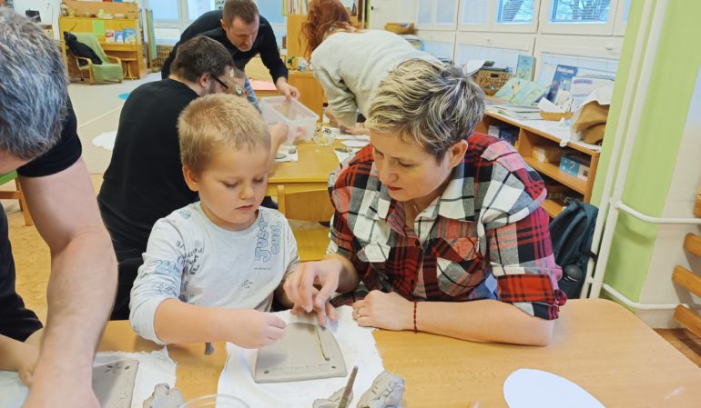 Společné tvoření z keramiky bylo plné radosti.Ve dvou odpoledních setkáních rodičů s dětmi vznikaly velmi zajímavé artefakty – rodinné erby. Námět vyšel z třídního projektu Zeleného klubíčka. Děti se chystaly objevovat celý svět a přišly na to, že nejprve je potřeba mít svoje „doma“. Aby se vždycky měly kam vracet a kde najdou přijetí, bezpečí a lásku. Proto se společně s rodiči pustily do práce, vymyslely a vytvořily rodinný erb z keramické hlíny. Vznikla pestrá dílka, která se suší a čekají na výpaly a glazování. Na tvoření s dětmi přišlo mnoho rodičů a tak budou mít doma trvalou vzpomínku na společné chvilky ve školce.