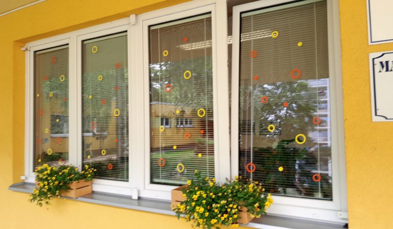 Velké prosklené plochy jsou pro ptactvo nebezpečnou pastí.Stopy nárazů ptáků do skleněných tabulí ve školce nalézáme často.  Příroda a obloha, zrcadlící se ve velikých oknech, je pro oči ptáků dělá neviditelnými.  Prudký náraz pak většinou končí fatálně. Pták uhyne okamžitě nebo později na následky vážného zranění.  Proto jsme se rozhodli ve spolupráci s Českou společností ornitologickou přispět k jejich ochraně. Dostali jsme od ní samolepky, které okna zviditelní. A tak se školka postupně stane puntíkatou. Některá okna můžeme polepit ihned, některá musí počkat, až budou umytá, teď by na nich samolepky nedržely.  Kolečka a puntíky ve žluté a oranžové barvě krásně ladí s fasádou a tak bude školka nejen bezpečná pro ptactvo, ale i krásná pro nás.