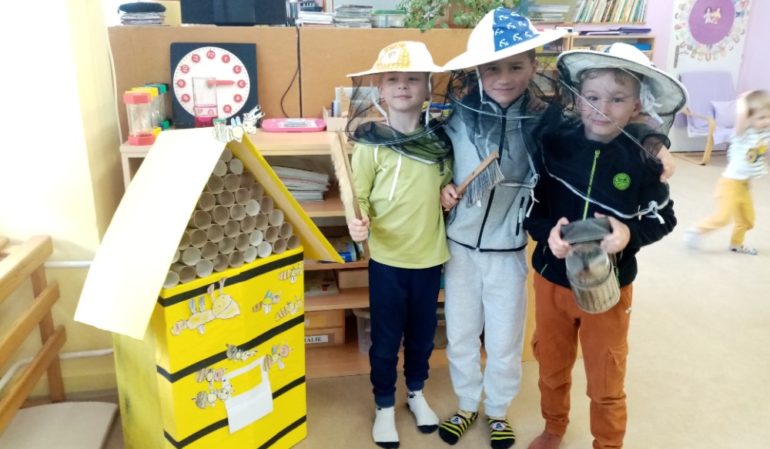 Do školky přijel včelař i s malým úlem plným včel.Cestoval k nám až  z Ústí nad Labem, aby dětem přivezl a ukázal včelí království se vším, co k němu patří. A že toho bylo! V malém úlu se včelky tiskly jedna na druhou, bzučely a čile se pohybovaly. Na ochranu před žihadlem dostaly děti ochranné kukly. Ochutnaly med i mateří kašičku, vyrobily si svíčky ze včelího vosku a dozvěděly se mnoho zajímavostí ze života včel. Hodně si také povídaly o práci včelaře a co všechno musí udělat proto, abychom si mohli  nabrat na lžičku oblíbený med.  Zajímavý a poučný program obohatil znalosti a zkušenosti dětí o významu a ochraně přírody a všeho živého, co v ní přebývá.
