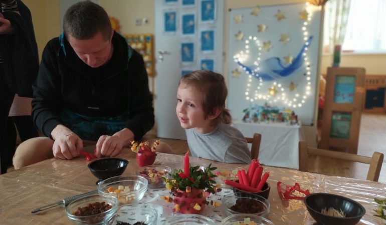 I malé děti ve Žlutém klubíčku umí vánočně tvořit.S pomocí svých rodičů zvládly sušeným ovocem a rozinkami krásně ozdobit jablíčkový svícen a vyrobit si „ledovou“ lampičku. A jako bonus ještě společně s rodiči vytvořily do svých portfolií vzpomínkovou vánoční koláž s fotografií a milým vzkazem.  Klidné a příjemné odpoledne, zastavení v předvánočním shonu, radost a úsměvy. Co více si přát….